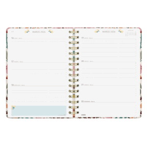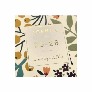 - Contenido: La anualidad de la agenda incluye: festivos nacionales, cambios de estación y días señalados. Contiene planificación mensual cuadriculada con las fases lunares intercalada en la anualidad. La agenda también dispone de otros contenidos extra: datos personales, calendarios, planificación anual en columnas, horarios, apartado para reflexiones/proyectos/ideas/retos, planes, maleta de viaje, apartado para libros/películas/series/pódcast, hojas para anotaciones y tareas, contactos, adhesivos temáticos y dos marcapáginas.