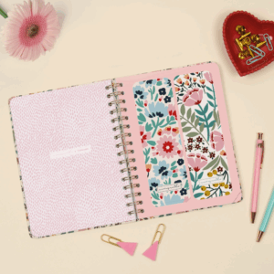 - Materiales principales: Tapas de cartón forrado con peliculado mate antirrayaduras. Espiral doble metálica. Papel.