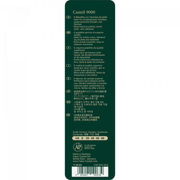 El Castell 9000 – el genuino lápiz clásico – fue lanzado por el Conde Alexander von Faber-Castell en 1905. Su calidad y variedad de graduaciones le han convertido en el favorito de ilustradores y artistas. Su mina encolada en toda la longitud del lápiz es especialmente resistente a la rotura. El Castell 9000 está disponible en 16 grados de dureza, convirtiéndose en el lápiz perfecto para aplicaciones técnicas y artísticas.
