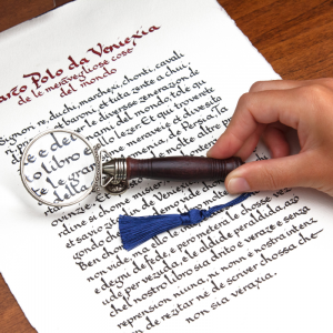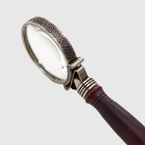 Conjunto compuesto por lupa en madera natural y bronce elegantemente cincelado, decorado con algodón azul y acabado con una pequeña bola de cristal de Murano azul. Un objeto útil que se convierte en decoración para tu escritorio. El diseño antiguo y el cuidado de las formas hablan por sí mismos. Deja que tus ojos sean el juez. Lente 2,5x de gran calidad.