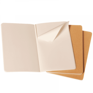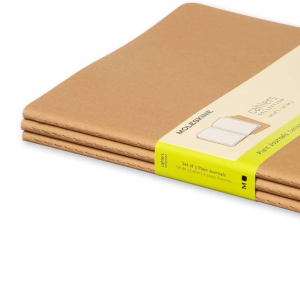 Los cuadernos Cahier de Moleskine tienen las tapas de cartulina resistente de con las costuras visibles en el lomo. Las últimas 16 hojas se pueden separar. En el interior se encuentra un amplio bolsillo ideal para hojas y recortes, que contiene la historia de Moleskine. Papel sin cloro y páginas lisas. Set de 3.