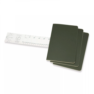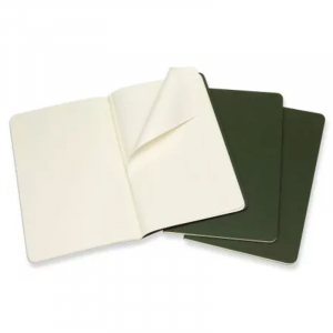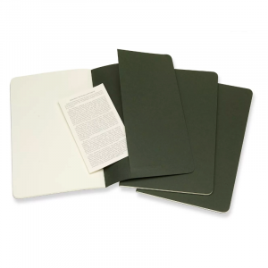 Los cuadernos Cahier de Moleskine tienen las tapas de cartulina resistente de con las costuras visibles en el lomo. Las últimas 16 hojas se pueden separar. En el interior se encuentra un amplio bolsillo ideal para hojas y recortes, que contiene la historia de Moleskine. Papel sin cloro y páginas lisas. Set de 3.