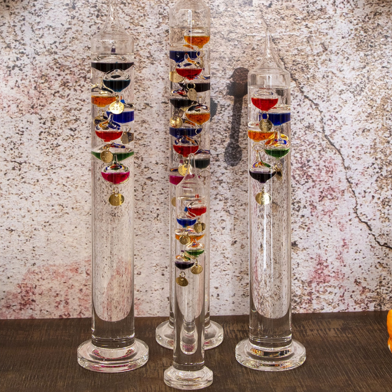 El termómetro de Galileo, fabricado en vidrio, es un decorativo instrumento de medida de temperatura.
