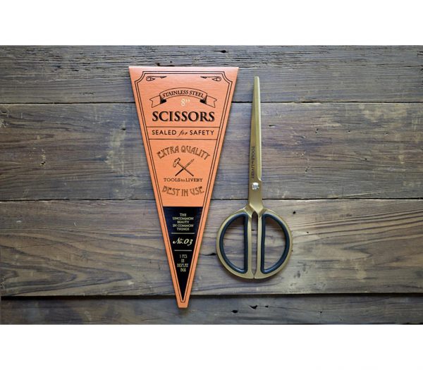 La tijera de 20 centímetros dorada está hecha de acero inoxidable japonés. Los anillos de la tijera están recubiertos de goma para faciltar su uso. El logotivo está grabado en una de las hojas. Viene con una elegante funda de papel.